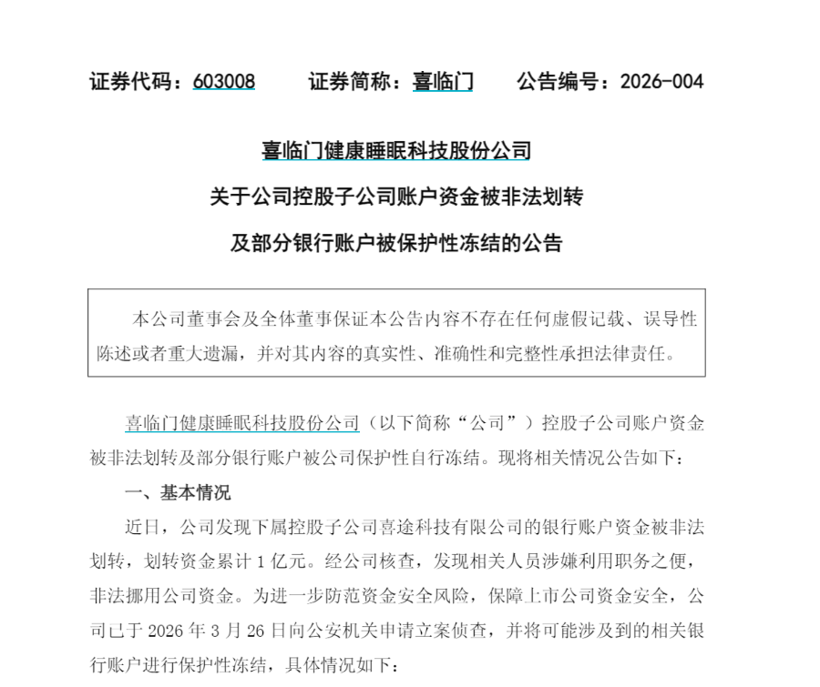 3月27日晚间,喜临门(603008)公告称,近日,公司发现下属控股子公司喜途科技有限公司的银行账户资金被非法划转,划转资金累计1亿元。公告披露,经公司核查,发现相关人员涉嫌利用职务之便,非法挪用公司资金。